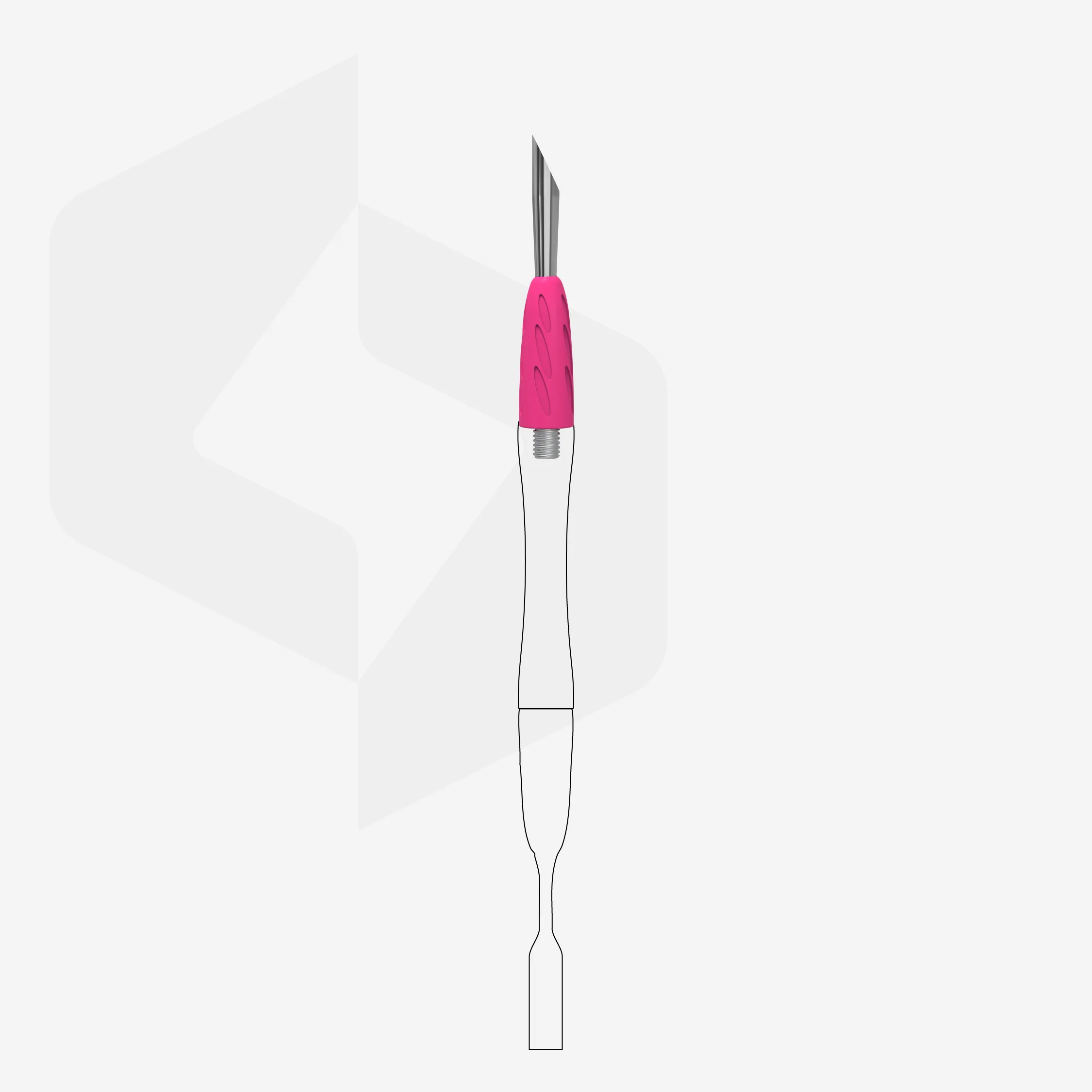 - Las piezas de trabajo de acero y la silicona son resistentes a todo tipo de desinfección y esterilización sin perder calidad. Se recomienda desinfectar y esterilizar el empujador ensamblado, sin necesidad de desenroscar y enroscar constantemente el instrumento, lo que simplifica y agiliza considerablemente el proceso de mantenimiento. Para mantener su calidad, lo mejor es utilizar desinfectantes especializados compatibles con el aluminio.